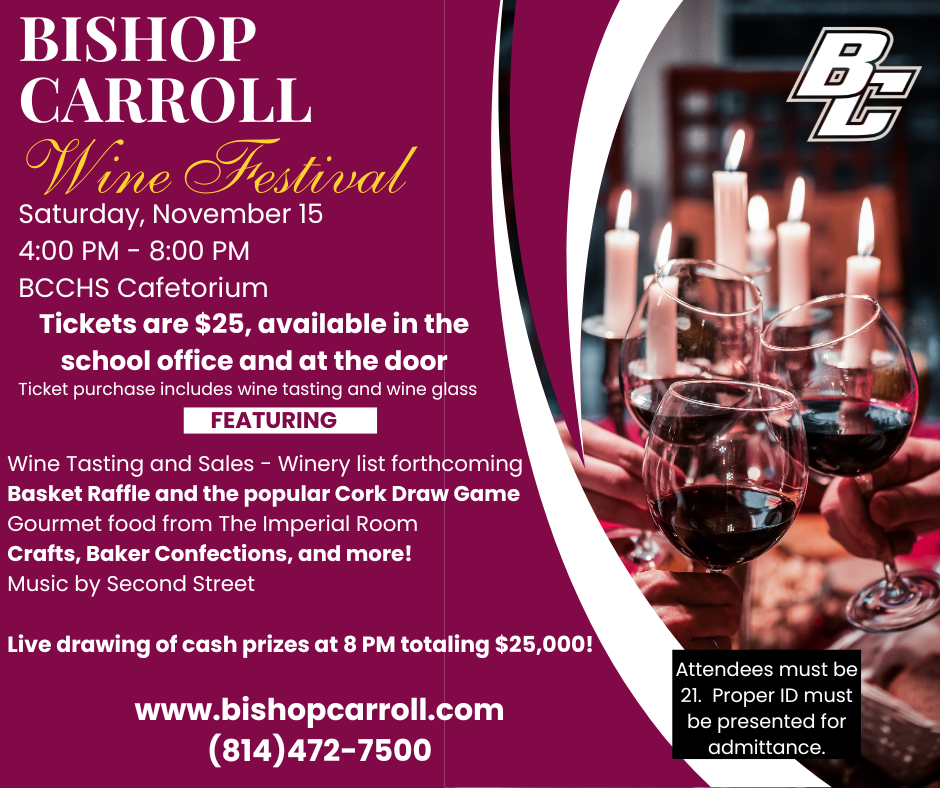 Bishop Carroll Wine Festival Information The Wine Festival is coming up on November 15. Get your tickets now!